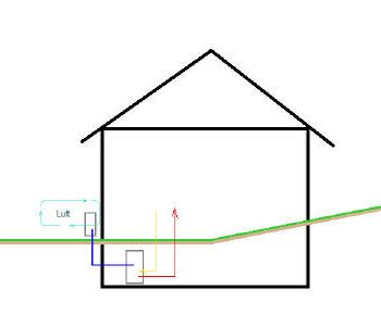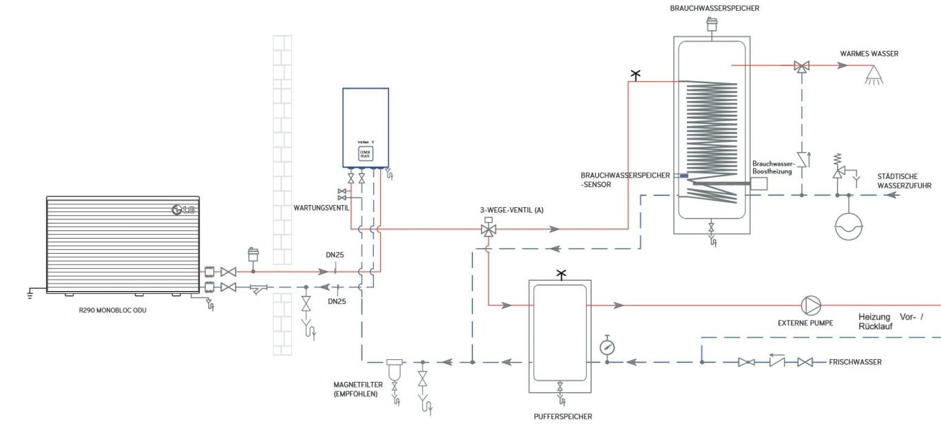 So, oder so ähnlich sollten die Außen- und die Inneneinheit an den bestehenden Wärmespeicher angeschlossen werden.